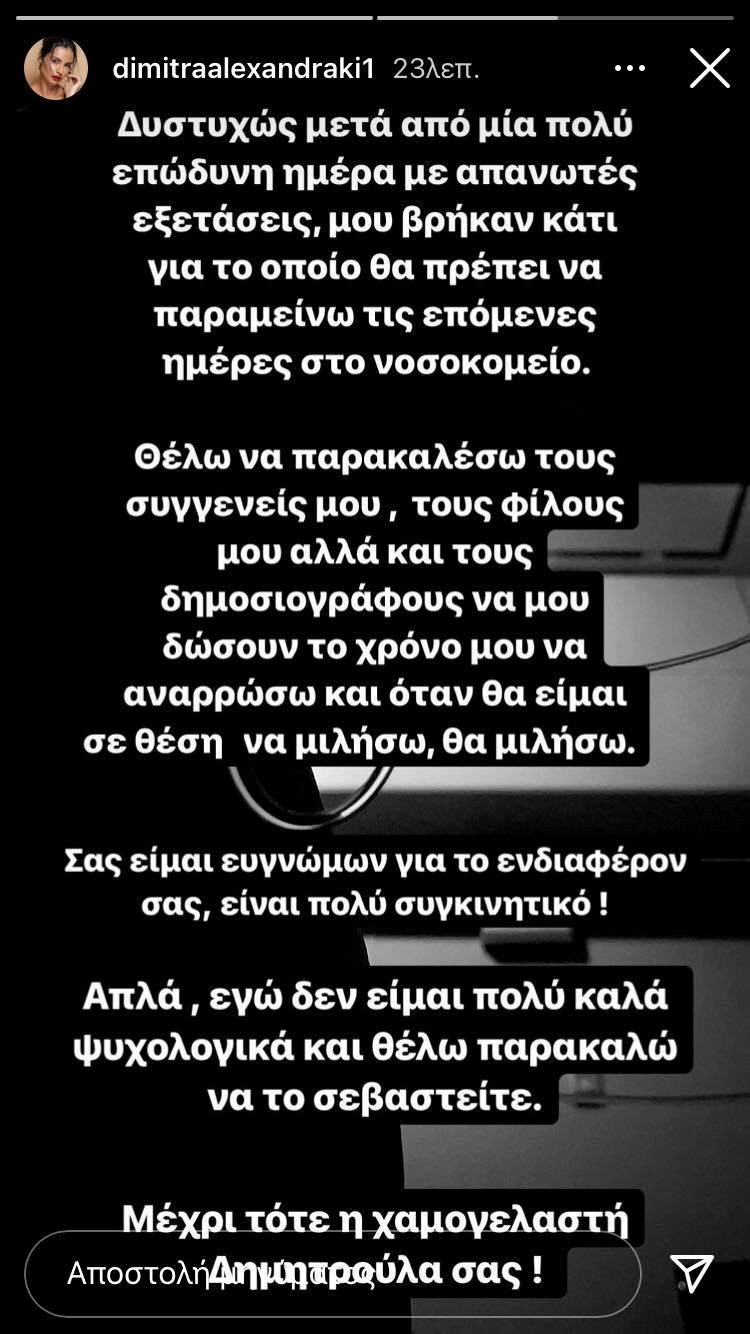 Το πρωί της Πέμπτης, η Δήμητρα Αλεξανδράκη επανήλθε με νέα ανάρτηση για να ενημερώσει τους διαδικτυακούς της φίλους πως για λίγες ημέρες θα χρειαστεί να νοσηλευτεί. Όταν νιώσει έτοιμη θα μιλήσει για το πρόβλημα υγείας της, αναφέρει στην ανάρτησή της.