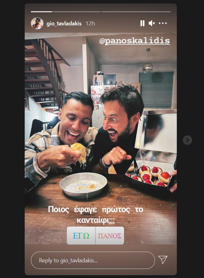 Οι δυο τους, που γνωρίζονταν και πριν το “Survivor 4”, βρέθηκαν ξανά μετά τη μοναδική εμπειρία που έζησαν και μοιράστηκαν ένα κανταΐφι, με τον Γιώργο Ταβλαδάκη να αναρτά σχετική φωτογραφία στο Instagram και να γράφει: “Ποιος έφαγε πρώτος το κανταΐφι;”.