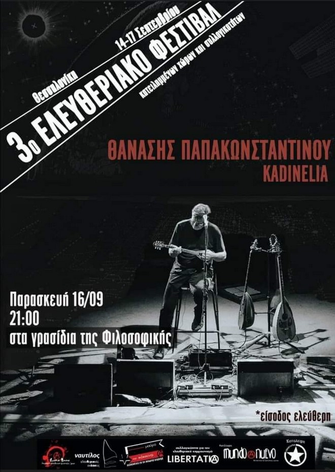 Στο Αριστοτέλειο Πανεπιστήμιο Θεσσαλονίκης θα τραγουδήσουν με ελεύθερη είσοδο απόψε, Παρασκευή (16/09), ο Θανάσης Παπακωνσταντίνου και οι Kadinelia σε μια κίνηση αλληλεγγύης προς τους φοιτητές που διαδηλώνουν κατά της Πανεπιστημιακής Αστυνομίας.