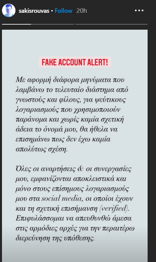 “Fake Account Alert! Με αφορμή διάφορα μηνύματα που λαμβάνω το τελευταίο διάστημα από γνωστούς και φίλους, για ψεύτικους λογαριασμούς που χρησιμοποιούν παράνομα και χωρίς καμία σχετική άδεια το όνομά μου, θα ήθελα να επισημάνω πως δεν έχω καμία απολύτως σχέση. Όλες οι αναρτήσεις και οι συνεργασίες μου, εμφανίζονται αποκλειστικά και μόνο στους επίσημους λογαριασμούς μου στα social media, οι οποίοι έχουν και τη σχετική επισήμανση (verified). Επιφυλάσσομαι να απευθυνθώ άμεσα στις αρμόδιες αρχές για την περαιτέρω διερεύνηση της υπόθεσης”, έγραψε.