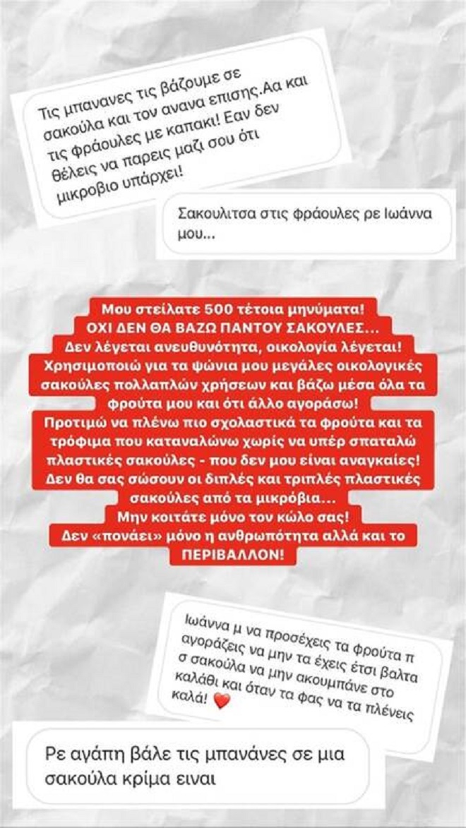 Η Ιωάννα Τούνη εκνευρίστηκε και σε insta story της ξεκαθάρισε πως δεν χρησιμοποιεί για όλα τα προϊόντα που αγοράζει πλαστικές σακούλες, λόγω του κακού που προκαλούν στο περιβάλλον, και πως επιλέγει οικολογικές σακούλες πολλαπλών χρήσεων.