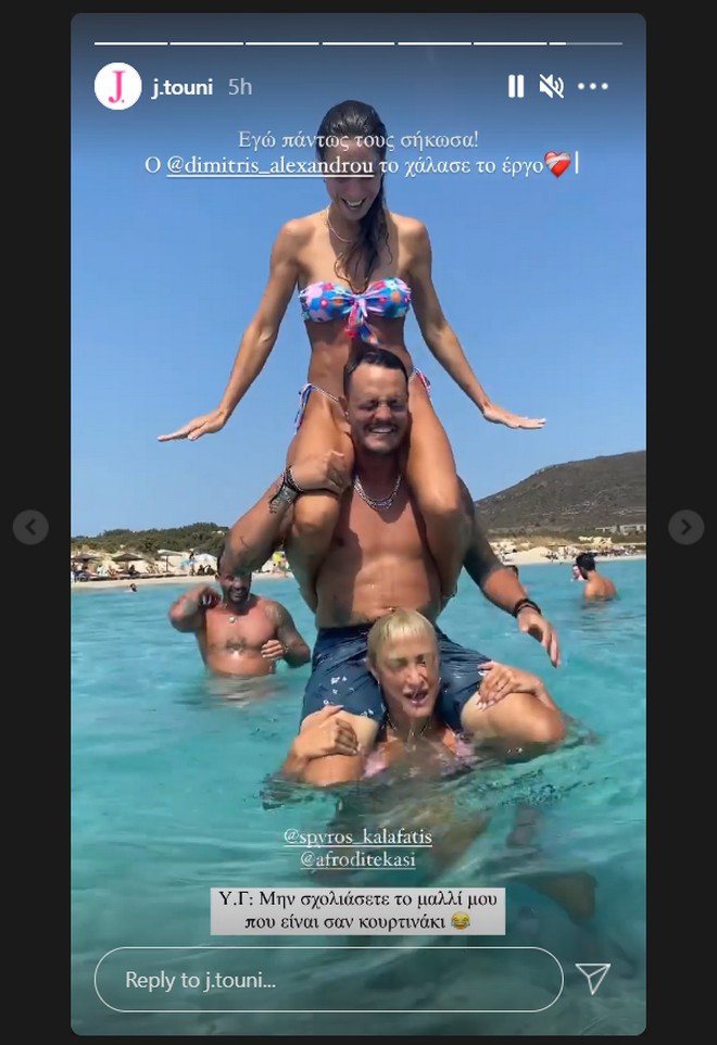 Αξίζει να σημειωθεί πως νωρίτερα το Σάββατο, η Ιωάννα Τούνη είχε κάνει γνωστό μέσω του Instagram πως βρίσκεται στην Ελαφόνησο για διακοπές και είχε δημοσιεύσει stories από παιχνίδια στη θάλασσα, παρέα με τον Δημήτρη Αλεξάνδρου.