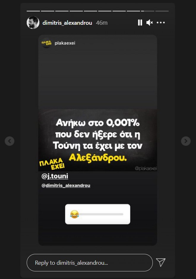 Λίγο μετά την ανάρτηση της Ιωάννας Τούνη, ο Δημήτρης Αλεξάνδρου δημοσίευσε στα insta stories του ένα αστείο meme που αφορά τη σχέση τους, επιβεβαιώνοντας έτσι κι ο ίδιος, με τον δικό του χιουμοριστικό τρόπο, τις φήμες.