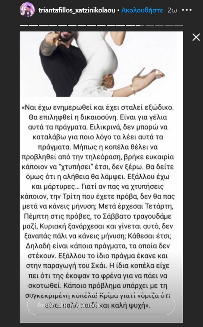 “Θα πω και κάτι τελευταίο, θα το μοιραστώ μαζί σας και θα το αφήσω εδώ και θα βάλω τελεία. Θα το αφήσω πίσω μου κι αυτό. Στη ζωή μου δε δέχομαι καμίας μορφής βία, δεν μου αρέσει το μπούλινγκ. Καταδικάζω τη βία, και ειδικά όταν η βία προέρχεται από άντρα σε γυναίκα. Έχω να καταγγείλω και γι’ αυτό υπάρχουν μαρτυρίες, ότι την προηγούμενη εβδομάδα ο κύριος Τριαντάφυλλος μου έκανε μπούλινγκ στην πρόβα στο στούντιο. Κάτι που συνέβη και μετά την εκπομπή της κυρίας Σίσσυς Χρηστίδου, στην οποία ανέφερα πως εάν μου ξαναδινόταν ως παρτενέρ, δεν θα τον δεχόμουν γιατί δεν είχα χημεία. Αυτά για να τα γνωρίζετε όλοι και να βγάζετε τα συμπεράσματά σας σωστά. Ναι στο μπόουλινγκ και όχι στο μπούλινγκ”.