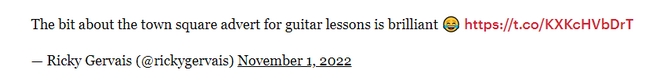 Φυσικά, ο Ρίκι Τζερβέις δεν το άφησε να πέσει κάτω και δημοσιεύοντας στο Twitter το συγκεκριμένο απόσπασμα από το διάσημο talk show του, έγραψε με ειρωνική διάθεση “το κομμάτι για τη διαφήμιση στην πλατεία της πόλης για τα μαθήματα κιθάρας είναι καταπληκτικό”. Ωστόσο, λίγη ώρα αργότερα το διέγραψε.