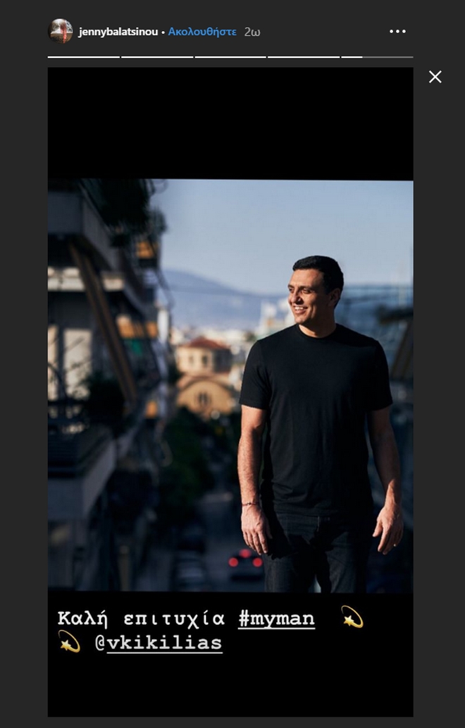 Η Τζένη ανέβασε μια φωτογραφία του Βασίλη Κικίλια σε story στον προσωπικό της λογαριασμό στο Instagram και έγραψε χαρακτηριστικά “Καλή επιτυχία #myman”, στέλνοντάς του τις ευχές της για καλή επιτυχία.