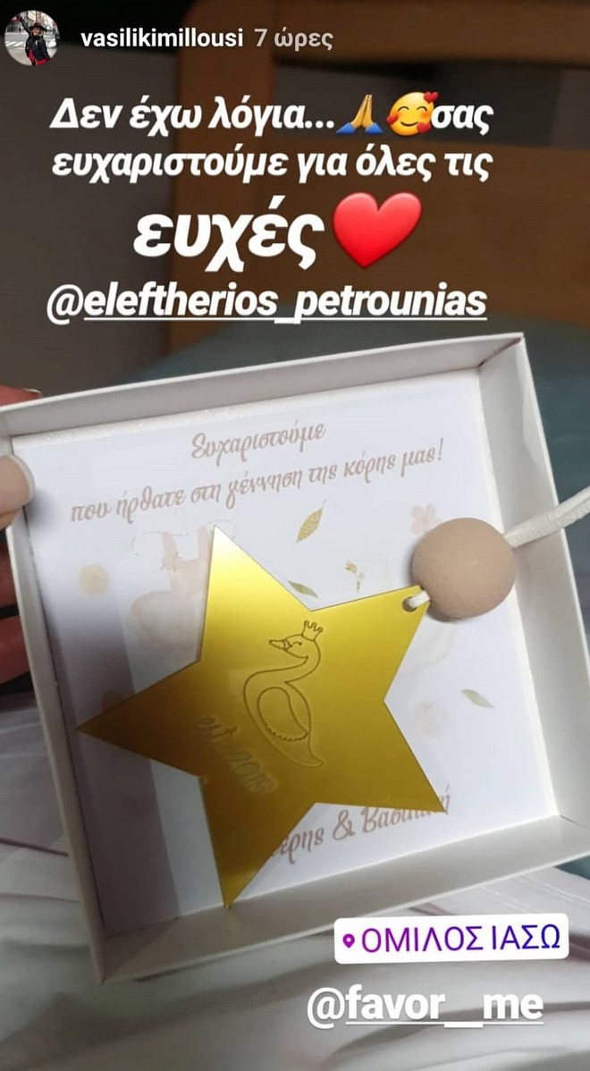 «Δεν έχω λόγια. Σας ευχαριστούμε για όλες τις ευχές» έγραψε χαρακτηριστικά η Βασιλική Μιλλούση σε φωτογραφία που ανέβασε στα instastories.