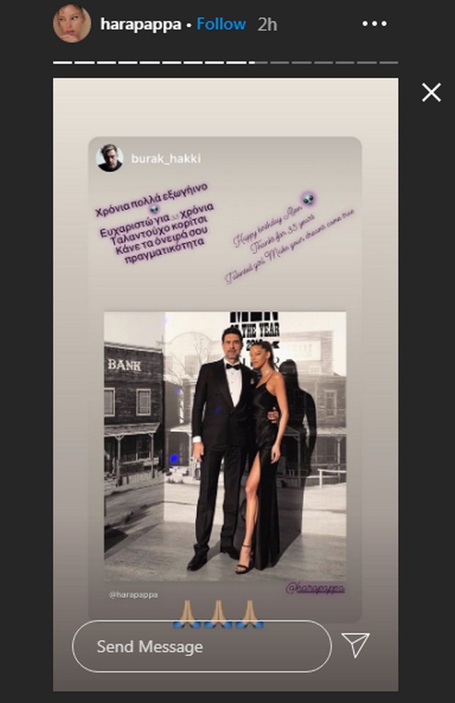Συγκεκριμένα, ο Μπουράκ Χακί δημοσίευσε σε story στον προσωπικό του λογαριασμό στο Instagram μια κοινή φωτογραφία τους από την περίοδο που ήταν μαζί και της έγραψε μερικά τρυφερά λόγια στα ελληνικά.