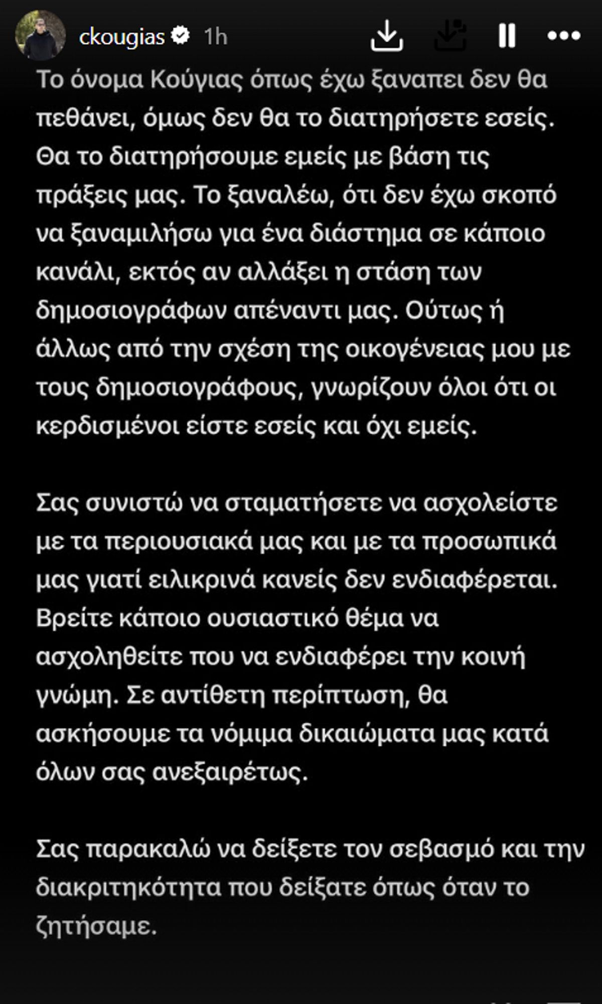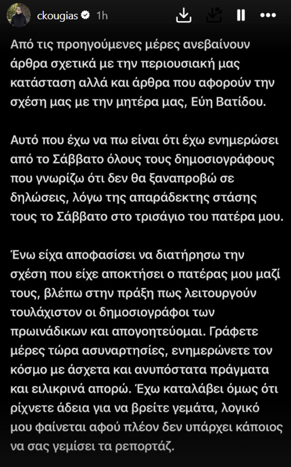 Αφορμή στάθηκε η απαράδεκτη, όπως τη χαρακτήρισε, στάση των δημοσιογράφων το περασμένο Σάββατο, στο τρισάγιο του γνωστού ποινικολόγου, αλλά και τα δημοσιεύματα που αφορούν την περιουσιακή κατάσταση της οικογένειας, αλλά και τη σχέση των δύο παιδιών του Αλέξη Κούγια με τη μητέρα τους, Εύη Βατίδου, όπως αναφέρει στην ανάρτησή του με τη μορφή story.