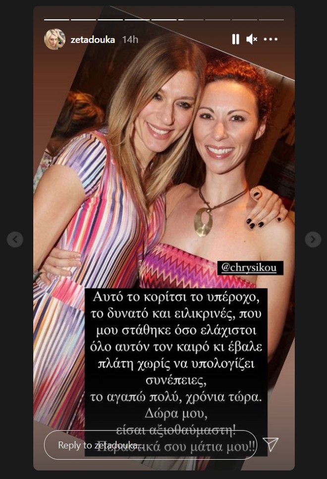 Η Ζέτα Δούκα εκφράζει την συμπαράστασή της στη συνάδελφό της, που δίνει μάχη που δίνει με τον καρκίνο. Η Δώρα Χρυσικού είχε σταθεί στο πλευρό της ηθοποιού όταν κατήγγειλε τον Γιώργο Κιμούλη.