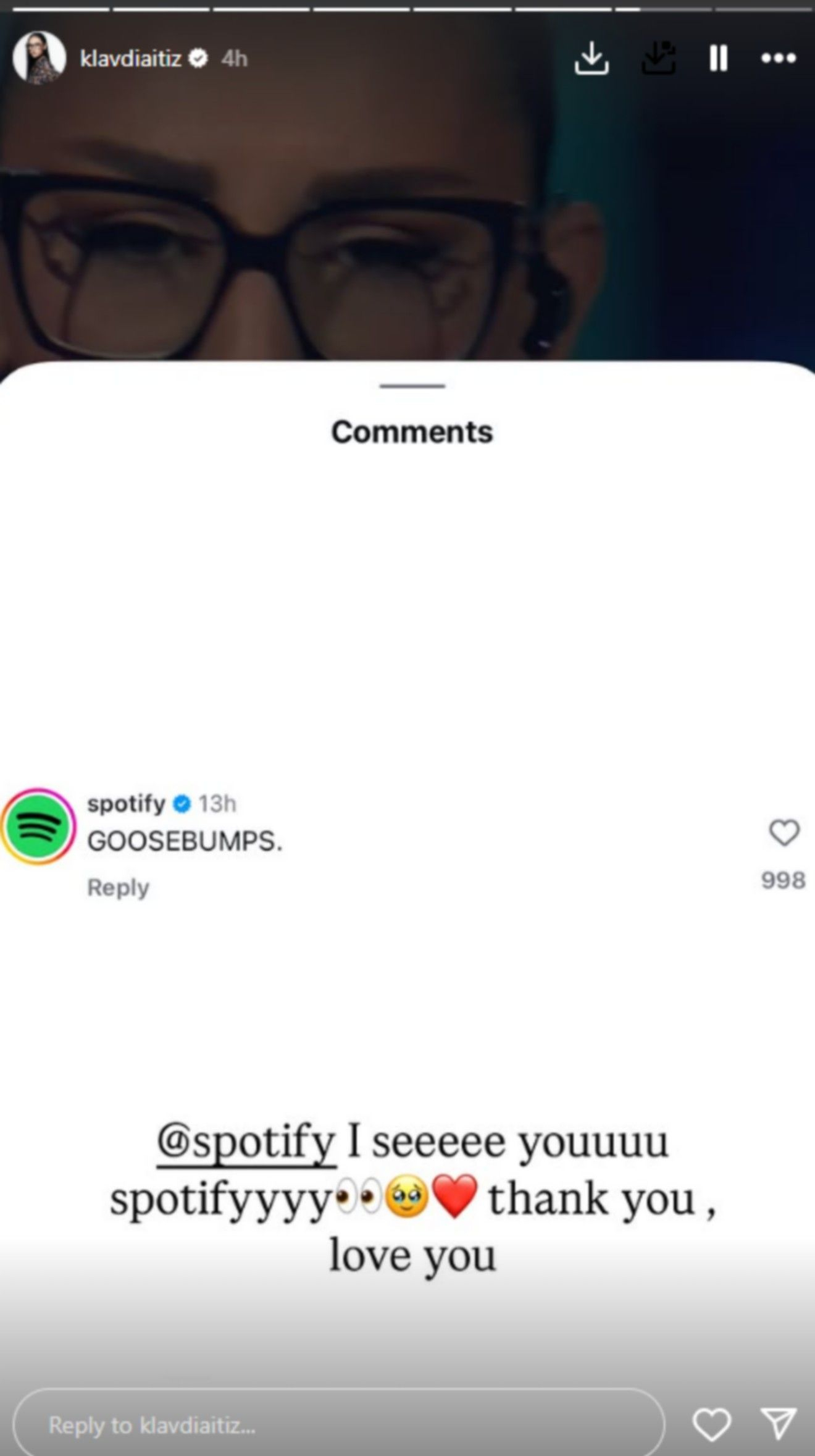 “I see you Spotify thank you, love you (σε βλέπω Spotify, σε ευχαριστώ, σε αγαπώ)”, έγραψε η Κλαυδία, ανοίγοντας διάλογο με τη δημοφιλή πλατφόρμα.