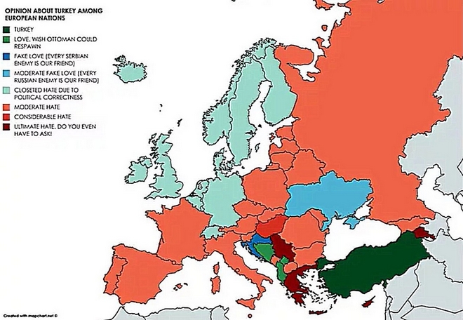 Με τιρκουάζ χρώμα (χώρες της Κεντρικής και Βόρειας Ευρώπης) είναι οι χώρες οι οποίες έχουν περιορισμένο μίσος για την Τουρκία και αυτό λόγω πολιτικής ορθότητας ενώ με ανοιχτό κόκκινο αυτές που έχουν “ελεγχόμενο” μίσος για την γειτονική χώρα.