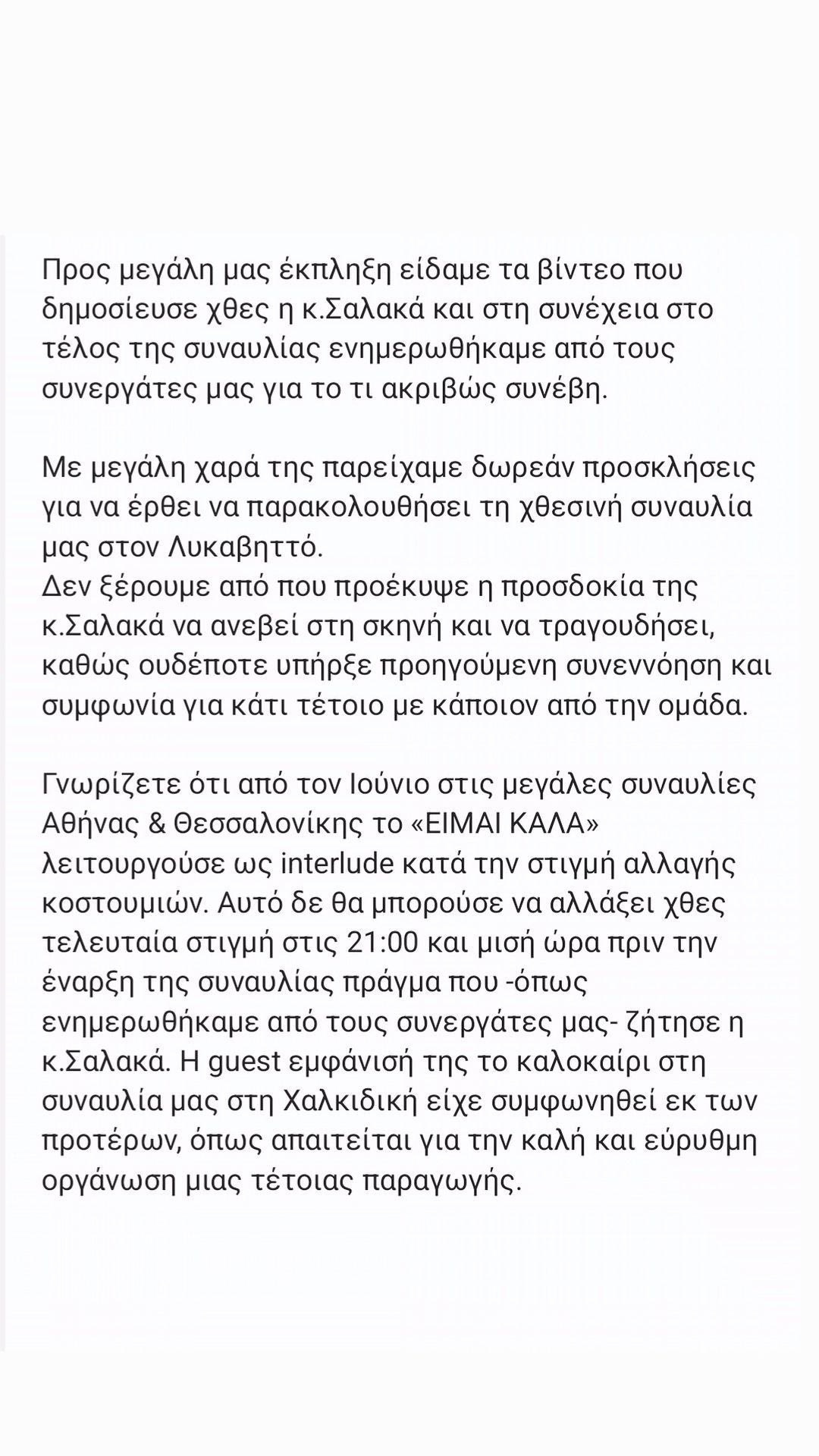 “Προς μεγάλη μας έκπληξη είδαμε τα βίντεο που δημοσίευσε χθες η κ. Σαλακά και στη συνέχεια, στο τέλος της συναυλίας, ενημερωθήκαμε από τους συνεργάτες μας για το τι ακριβώς συνέβη. Με μεγάλη χαρά τής παρείχαμε δωρεάν προσκλήσεις για να έρθει να παρακολουθήσει τη χθεσινή μας συναυλία στον Λυκαβηττό. Δεν ξέρουμε από που προέκυψε η προσδοκία της κα. Σαλακά να ανέβει στη σκηνή και να τραγουδήσει, καθώς ουδέποτε υπήρξε προηγούμενη συνεννόηση και συμφωνία για κάτι τέτοιο με κάποιον από την ομάδα.