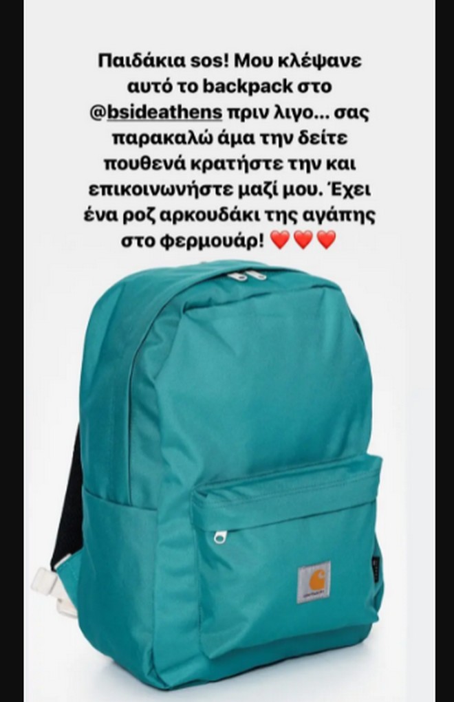 “Παιδάκια sos! Μου κλέψανε αυτό το backpack.. σας παρακαλώ άμα τη δείτε επικοινωνήστε μαζί μου. Έχει ένα ροζ αρκουδάκι της αγάπης στο φερμουάρ” έγραψε στην πρώτη φωτογραφία ο Παύλος Χάππιλος.
