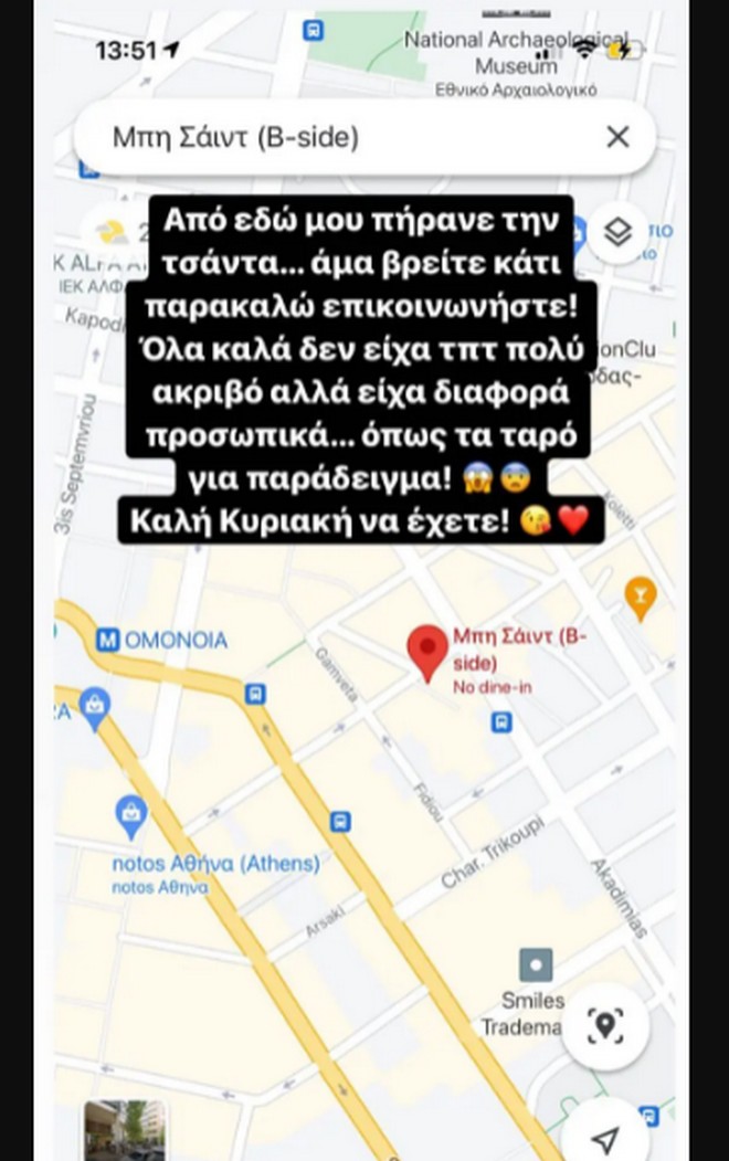 Λίγο αργότερα, σε δεύτερη φωτογραφία που ανήρτησε, ο ίδιος έγραψε: “Από εδώ μου πήρανε την τσάντα… άμα βρείτε κάτι παρακαλώ επικοινωνήστε! Όλα καλά δεν είχα τπτ πολύ ακριβό, αλλά είχα διάφορα προσωπικά… όπως τα ταρό για παράδειγμα! Καλή Κυριακή να έχετε”.