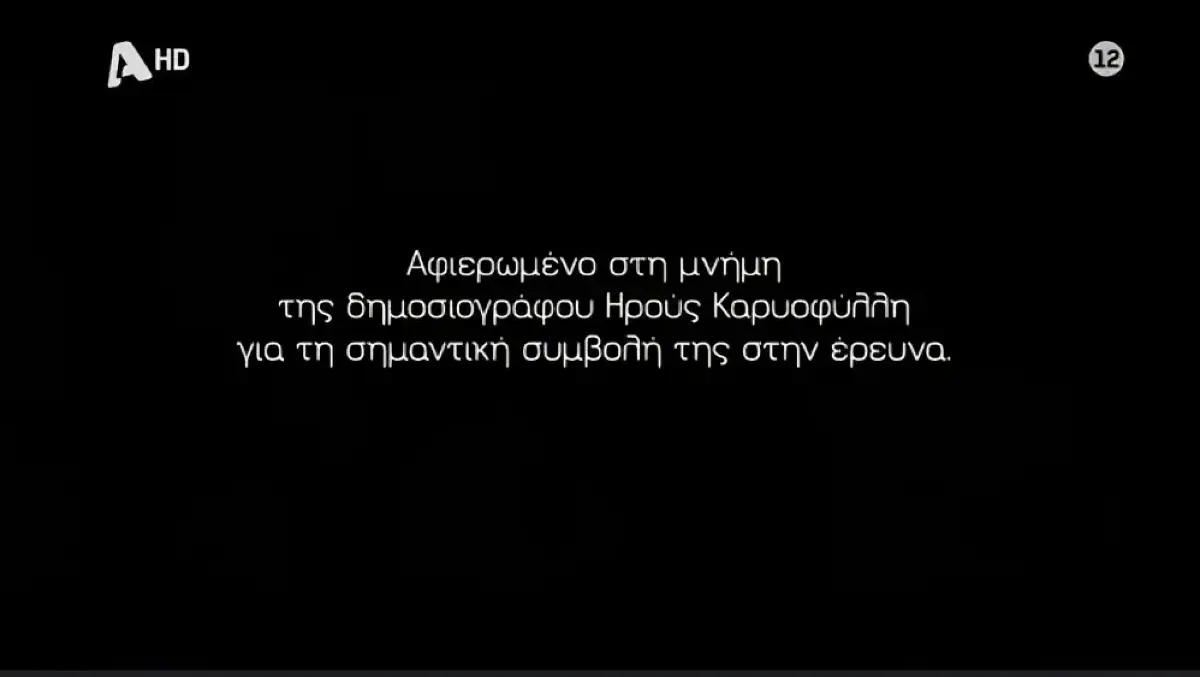 “Αφιερωμένο στη μνήμη της δημοσιογράφου Ηρούς Καρυοφύλλη για τη σημαντική συμβολή της στην έρευνα” σημειώθηκε χαρακτηριστικά στην κάρτα που προβλήθηκε στους τηλεοπτικούς μας δέκτες αμέσως μετά την τελευταία σκηνή.