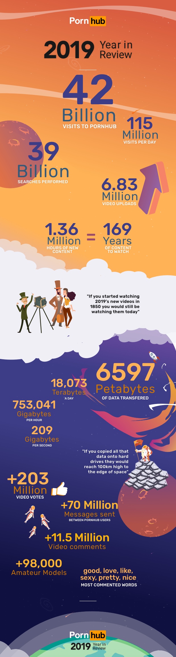 Συνολικά οι επισκέψεις έφτασαν τα 42 δισεκατομμύρια, κάτι που αναλογεί σε 115 εκατομμύρια επισκέψεις τη μέρα. Το 2019 είχαμε ρεκόρ σε video uploads με πάνω από 6,83 εκατομμύρια νέα βίντεο να εμφανίζονται στη σελίδα.