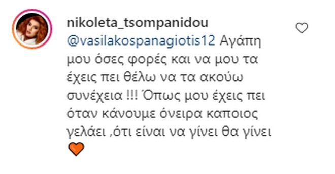 “Νικολέττα μου ότι και να γράψω για εσένα είναι λίγο! Στα έχω πει όλα από κοντά αμέτρητες φορές ! Είσαι ξεχωριστός άνθρωπος όπου η καλοσύνη σου ξεπερνάει τα ανθρώπινα όρια ! Αυτό με κέρδισε σε εσένα! Μας εύχομαι ότι καλύτερο! Ότι είναι να γίνει θα γίνει!!”, έγραψε χαρακτηριστικά ο Παναγιώτης.
