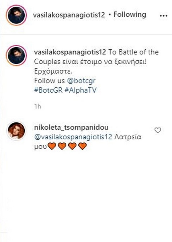 “Το Battle of the Couples είναι έτοιμο να ξεκινήσει! Ερχόμαστε”, έγραψε ο Παναγιώτης Βασιλάκος, με την αγαπημένη του, Νικόλ Τσομπανίδου να σχολιάζει “λατρεία μου”.