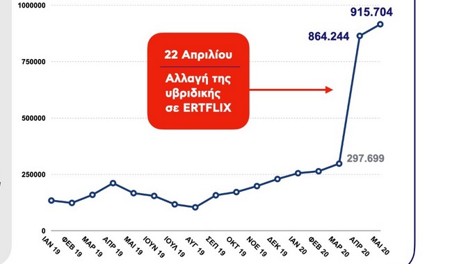 Το πρώτο δίμηνο μόνο, περισσότεροι από 1,7 εκατομμύρια τηλεθεατές είχαν πατήσει το κόκκινο κουμπί στο τηλεκοντρόλ τους για να δουν ERTFLIX, ενώ μέχρι τα μέσα Ιουνίου προστέθηκαν άλλες 130.000 νέες συνδεδεμένες τηλεοράσεις. Με τους ρυθμούς που η πλατφόρμα της ΕΡΤ κερδίζει το ενδιαφέρον, την επισκειμότητα ή και την καθημερινότητα των χρηστών δεν αποκλείεται μέχρι το τέλος του καλοκαιριού, οι επισκέψεις να φτάσουν τα 2 εκατομμύρια. Όχι άσχημα για διάστημα που δεν έχει ξεπεράσει ακόμη τους τρεις μήνες, όταν στην πρότερη εποχή και παρουσία της υβριδικής πλατφόρμας την περασμένη τριετία, η μηνιαία καταγραφή δεν έφερε ποτέ επισκέψεις που να ξεπερνούσαν τις 220.000.