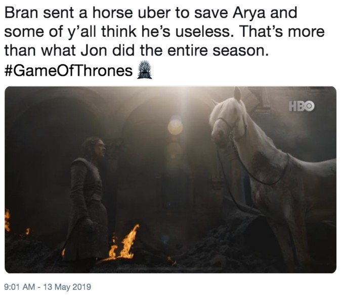 Για άλλους, το άλογο ήταν στην ουσία ο Bran ο οποίος έκανε warg σε έναν από τους ίππους των Ντοθράκι και πήγε εκεί την κατάλληλη ώρα για να σώσει την αδερφή του. Τραγική ειρωνεία; Αν η Arya σκοτώσει την Καλίσι αφού θα έχει διαφύγει από το ολοκαύτωμά της με ένα ζώο όμοιο με το αγαπημένο του Khal Drogo.