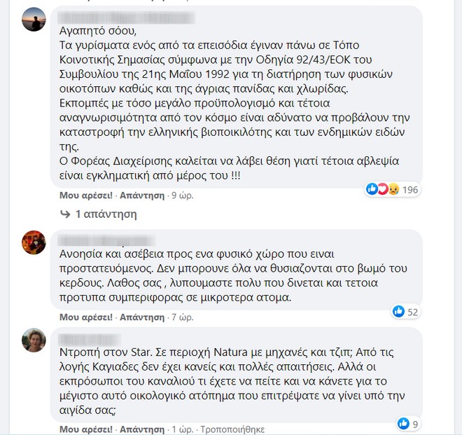 Τα σχόλια πήραν φωτιά σε Facebook και Twitter, κατηγορώντας την παραγωγή και το Star για την απόφαση να “εισβάλουν” σε μια προστατευόμενη περιοχή με σπάνια είδη φυτών, για την οποία γίνονται τόσες προσπάθειες και ενέργειες ώστε να διατηρηθεί το εν λόγω οικοσύστημα. Πέρα από την πράξη της, η παραγωγή δίνει και το λάθος παράδειγμα προς τους τηλεθεατές για την προστασία του περιβάλλοντος, σε μια εποχή, μάλιστα, που το οικολογικό πρόβλημα είναι μεγαλύτερο από ποτέ.