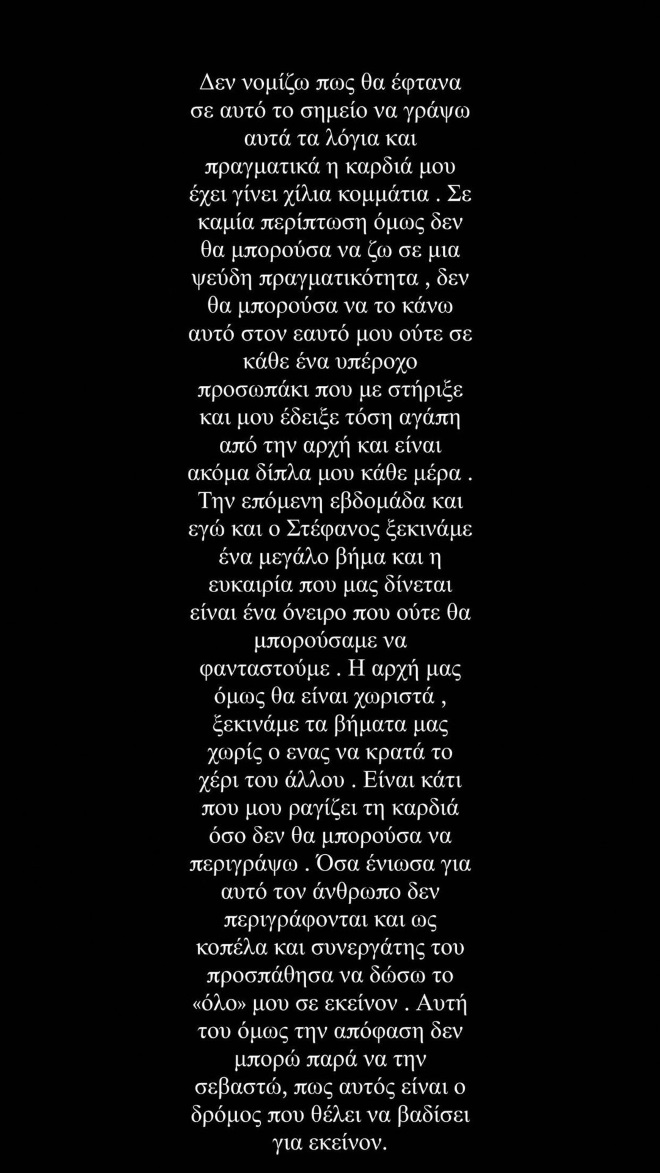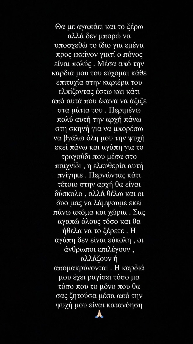 “Δε νομίζω πως θα έφτανα σε αυτό το σημείο να γράψω αυτά τα λόγια και πραγματικά η καρδιά μου έχει γίνει χίλια κομμάτια. Σε καμία περίπτωση όμως δεν θα μπορούσα να ζω σε μια ψευδή πραγματικότητα, δεν θα μπορούσα να το κάνω αυτό στον εαυτό μου ούτε σε κάθε ένα υπέροχο προσωπάκι που με στήριξε και μου έδειξε τόση αγάπη από την αρχή και είναι ακόμα δίπλα μου κάθε μέρα. Την επόμενη βδομάδα και εγώ και ο Στέφανος ξεκινάμε ένα μεγάλο βήμα κι ευκαιρία που μας δίνεται είναι ένα όνειρο που ούτε θα μπορούσαμε να φανταστούμε. Η αρχή μας όμως θα είναι χωριστά, ξεκινάμε τα βήματά μας χωρίς ο ένας να κρατά το χέρι του άλλου. Είναι κάτι που μου ραγίζει την καρδιά όσο δεν θα μπορούσα να περιγράψω. Όσα ένιωσα για αυτόν τον άνθρωπο δεν περιγράφονται και ως κοπέλα και συνεργάτης του προσπάθησα να δώσω το “όλο” μου σε εκείνον. Αυτή του όμως την απόφαση δεν μπορώ παρά να την σεβαστώ, πως αυτός είναι ο δρόμος που θέλει να βαδίσει για εκείνον. Θα με αγαπάει και το ξέρω αλλά δεν μπορώ να υποσχεθώ το ίδιο για εμένα προς εκείνον γιατί ο πόνος είναι πολύς. Μέσα από την καρδιά μου του εύχομαι κάθε επιτυχία στην καριέρα του ελπίζοντας έστω και κάτι από αυτά που έκανα να άξιζε στα μάτια του. Περιμένω πολύ αυτή την αρχή πάνω στη σκηνή για να μπορέσω να βγάλω όλη μου την ψυχή εκεί πάνω και αγάπη για το τραγούδι που μέσα στο παιχνίδι, η ελευθερία αυτή πνίγηκε. Περνώντας κάτι τέτοιο στην αρχή θα είναι δύσκολο, αλλά θέλω και οι δυο μας να λάμψουμε εκεί πάνω ακόμα και χώρια. Σας αγαπώ όλους τόσο και θα ήθελα να το ξέρετε. Η αγάπη δεν είναι εύκολη, οι άνθρωποι επιλέγουν, αλλάζουν ή απομακρύνονται. Η καρδιά μου έχει ραγίσει τόσο μα τόσο που το μόνο που θα σας ζητούσα μέσα από την ψυχή μου είναι κατανόηση”.