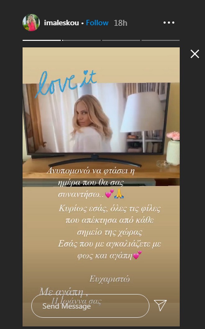 Η εκπομπή θα ονομάζεται “Love it” και η Ιωάννα Μαλέσκου είναι ιδιαίτερα ανυπόμονη για το νέο της εγχείρημα, όπως αποκάλυψε η ίδια, με το μήνυμα που έγραψε στον προσωπικό της λογαριασμό στο Instagram καθώς παρακολουθούσε το trailer στην τηλεόραση: