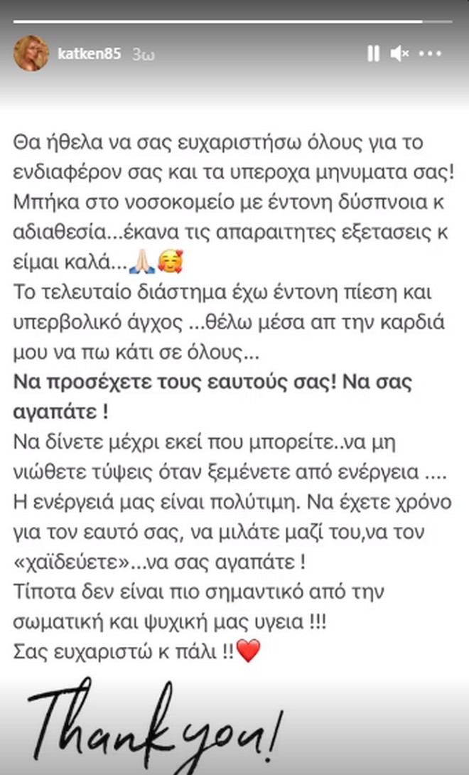 “Θα ήθελα να σας ευχαριστήσω όλους για το ενδιαφέρον σας και τα μηνύματά σας! Μπήκα στο νοσοκομείο με έντονη δύσπνοια και αδιαθεσία… έκανα τις απαραίτητες εξετάσεις και είμαι καλά…