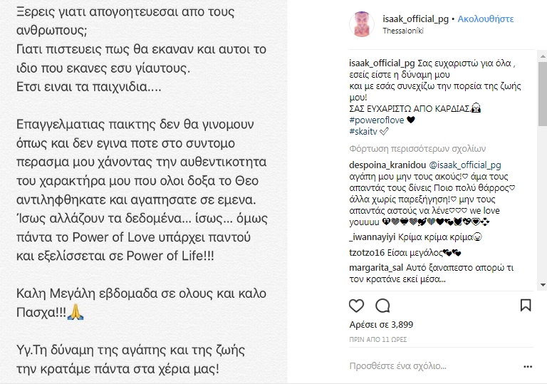 «Ξέρεις γιατί απογοητεύεσαι από τους ανθρώπους; Γιατί πιστεύεις ότι θα έκαναν κι αυτοί το ίδιο που έκανες εσύ για αυτούς. Έτσι είναι τα παιχνίδια… Επαγγελματίας παίκτης δεν θα γινόμουν, όπως και δεν έγινα ποτέ στο σύντομο πέρασμά μου, χάνοντας την αυθεντικότητα του χαρακτήρα μου που όλοι δόξα τω Θεώ αντιληφθήκατε και αγαπήσατε σε εμένα. Ίσως αλλάζουν τα δεδομένα… ίσως… όμως πάντα το Power of Love υπάρχει παντού και εξελίσσεται σε Power of Life! Καλή Μεγάλη εβδομάδα σε όλους και καλό Πάσχα! Υ.Γ. Τη δύναμη της αγάπης και της ζωής την κρατάμε πάντα στα χέρια μας!».