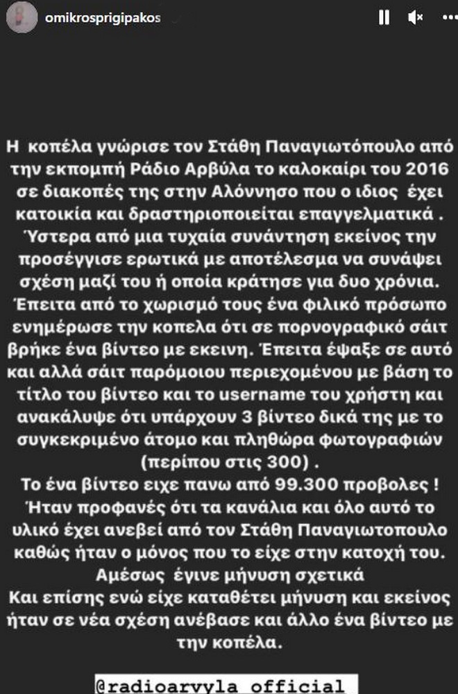 Όπως μεταφέρει στις αναρτήσεις του ο χρήστης που κοινοποίησε την καταγγελία, η κοπέλα που φέρεται να έχει κινηθεί και νομικά κατά του παρουσιαστή, είχε συνάψει διετή σχέση μαζί του το 2016, μετά από γνωριμία τους στην Αλόννησο. Σύμφωνα με την καταγγελία, μετά τον χωρισμό τους, η κοπέλα εντόπισε πορνογραφικό υλικό (βίντεο και φωτογραφίες) με συμμετοχή της ίδιας και χωρίς τη συγκατάθεσή της, το οποίο φέρεται “να είχε ανέβει από τον Στάθη Παναγιωτόπουλο, καθώς ήταν ο μόνος που το είχε στην κατοχή του”, όπως χαρακτηριστικά αναφέρεται στις αναρτήσεις.