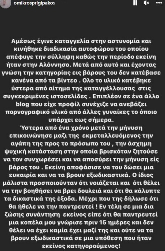 Εν συνεχεία, τονίζεται ότι ο Στάθης Παναγιωτόπουλος, ο οποίος “συνέχιζε να ανεβάζει πορνογραφικό υλικό από άλλες γυναίκες”, προσέγγισε ένα χρόνο μετά την μήνυση την κοπέλα, ζητώντας να την αποσύρει και εκφράζοντας μάλιστα ενδιαφέρον προς το πρόσωπό της: “Ο ίδιος προσποιούνται ότι νοιάζει και ότι θέλει να τη βοηθήσει να βρει δουλειά. Μέχρι που της δήλωσε ότι ήθελε να την παντρευτεί!”.