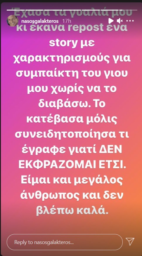 “Έχασα τα γυαλιά μου και ένα repost ένα story με χαρακτηρισμούς για συμπαίκτη του γιου μου, χωρίς να το διαβάσω. Το διέγραψα μόλις συνειδητοποίησα τι έγραφε, γιατί δεν εκφράζομαι έτσι. Είμαι και μεγάλος άνθρωπος και δεν βλέπω καλά”, έγραψε στη νέα του ανάρτηση ο Νάσος Γαλακτερός.