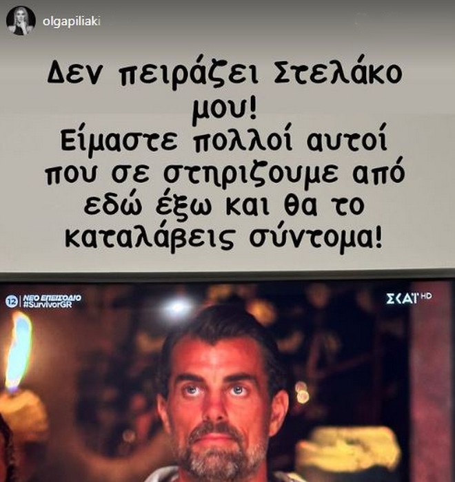“Δεν πειράζει Στελάκο μου. Είμαστε πολλοί αυτοί που σε στηρίζουμε από εδώ έξω και θα το καταλάβεις σύντομα”, έγραψε.