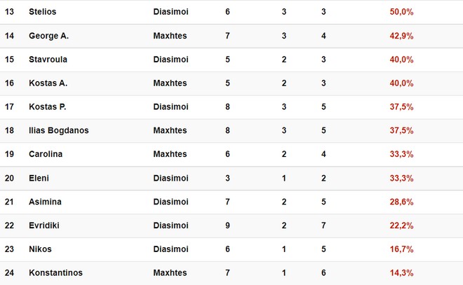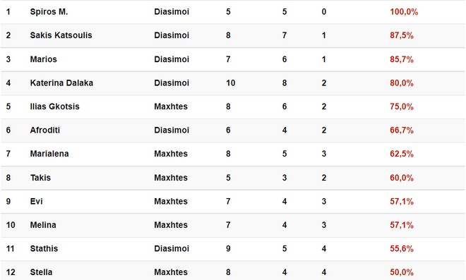 Στην κορυφή της κατάταξης βλέπουμε να φιγουράρει στην πρώτη θέση στα στατιστικά ο Σπύρος Μαρτίκας, με ποσοστό νικών 100%. Ο παίκτης των Διασήμων είναι εξαιρετικά ανταγωνιστικός και θεωρείται ήδη το μεγάλο φαβορί για το έπαθλο.