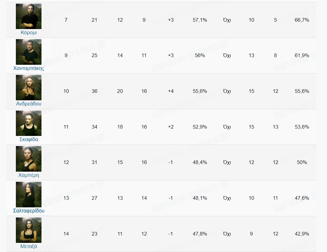 Σημειώνεται ότι η γυναίκα με τα καλύτερα στατιστικά είναι η Σταυρούλα Χρυσαειδή, η οποία βρίσκεται στη δεύτερη θέση της γενικής κατάταξης. Το ποσοστό νικών της ανέρχεται στο 74,1%.
