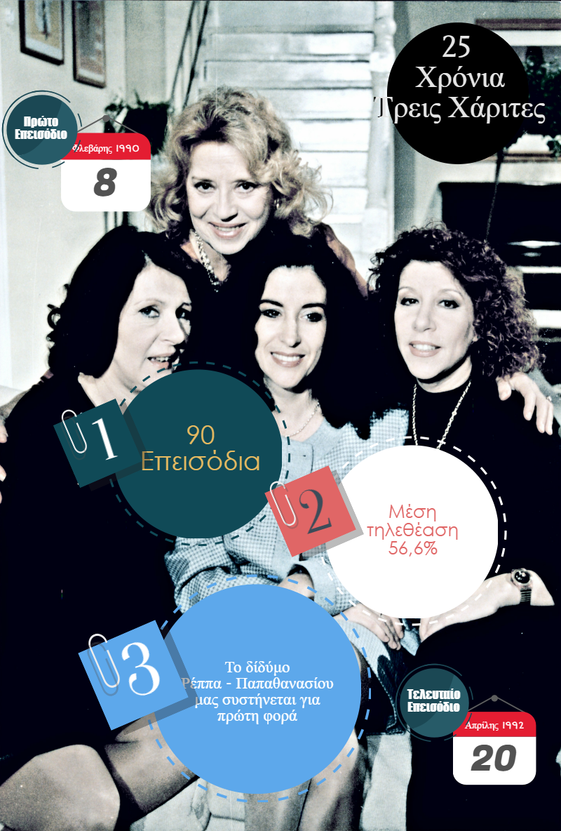 “Η ζωή δεν τελειώνει σε ένα σίριαλ. Η ζωή συνεχίζεται”! Με αυτή τη φράση έμπαινε ο επίλογος στη σειρά “Τρεις Χάριτες” στις 20 Απριλίου του 1992. Η Όλγα, η Μαρία και η Ειρήνη αποχαιρετούσαν δια παντός τους τηλεθεατές που τους αγάπησαν και τους ξεχώρισαν στο νεοσύστατο τότε μεγάλο κανάλι. Σήμερα, 25 χρόνια μετά, θυμόμαστε τους λόγους που μια σειρά σαν τις “Τρεις Χάριτες” γνώρισε τόσο μεγάλη επιτυχία και τις αιτίες που ένα σίριαλ από τα πρώτα χρόνια της ιδιωτικής τηλεόρασης, έχει περάσει στο πάνθεον της ελληνικής μυθοπλασίας και θεωρείται πια σήμερα κλασική ελληνική κωμωδία.