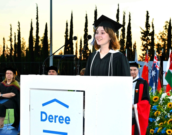 Στη συνέχεια, η Άννα Μαρία Δημητροπούλου, απόφοιτη του τμήματος Σπουδών Κινηματογράφου, απηύθυνε λόγο στο ακροατήριο της Αποφοίτησης. Συγκινημένη δήλωσε: «Πρόεδρε Horner, μέλη της Διοίκησης του Κολλεγίου, εκλεκτοί προσκεκλημένοι και αγαπημένοι συναπόφοιτοι. Καλώς ήρθατε και συγχαρητήρια και γι’ αυτό το επιτυχημένο ορόσημο. Ως απόφοιτος Σπουδών Κινηματογράφου, αντιλαμβάνομαι τις ζωές των ανθρώπων όπως και τη δική μου, ως ξεχωριστές, μοναδικές ταινίες, με αρκετή κωμωδία, δράμα, περισσότερο δράμα, λίγη συγκίνηση εδώ κι εκεί, ρομαντισμό και ούτω καθεξής. Όλα μαζί συμβάλλουν σε ένα όμορφο και απόλυτα ισορροπημένο έργο τέχνης που ονομάζεται ”ζωή“. Η δική μου ταινία ξεκίνησε ακριβώς πριν μπω στην οικογένεια του Deree, όταν η οικογένειά μου υπέστη μια μεγάλη τραγωδία. Η γενέτειρά μου κάηκε ολοσχερώς αφήνοντάς μας οικονομικά πληγωμένους και ψυχικά συντετριμμένους. Τότε, το Deree μού έδωσε την ευκαιρία να φοιτήσω με υποτροφία. Σε αυτό το πολυπολιτισμικό περιβάλλον, έμαθα πώς να εξελίσσομαι ακαδημαϊκά ενώ, μελετώντας και δουλεύοντας δίπλα σε ανθρώπους με διαφορετικό υπόβαθρο, απέκτησα ποικίλες γνώσεις. Ας βάλουμε πλώρη για το αύριο με στόχο ένα θετικό αντίκτυπο για τον κόσμο μας. Συγχαρητήρια, τάξη του 2024!».