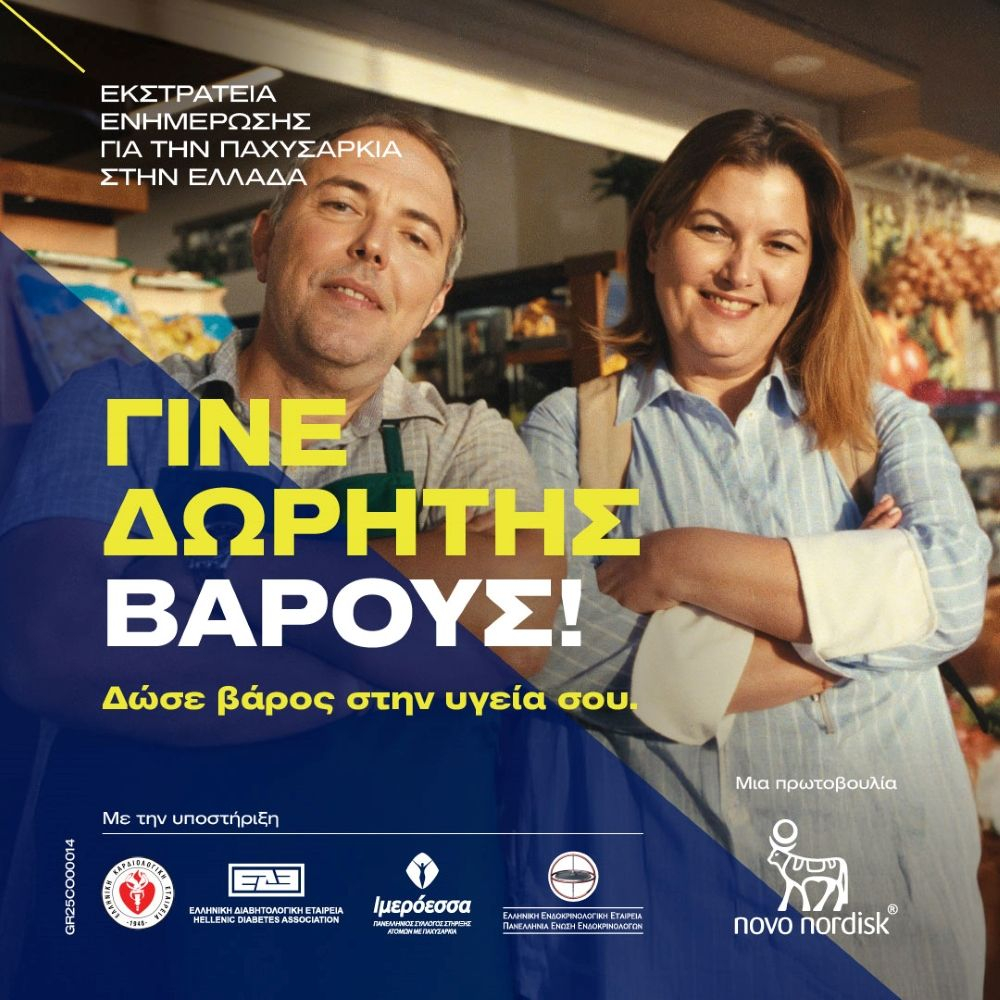 Η εκστρατεία ενημέρωσης και ευαισθητοποίησης της Novo Nordisk Hellas με τίτλο «Γίνε δωρητής βάρους – Δώσε βάρος στην υγεία σου», κάνει πρεμιέρα σε τηλεόραση, ραδιόφωνο και social media. Με πρωταγωνιστές οικεία πρόσωπα της καθημερινότητάς μας, η εκστρατεία αποσκοπεί στο να ενημερώσει και να ευαισθητοποιήσει το κοινό σχετικά με τη σοβαρή χρόνια νόσο της παχυσαρκίας, η οποία απαιτεί ολιστική προσέγγιση για την αποτελεσματική διαχείρισή της.