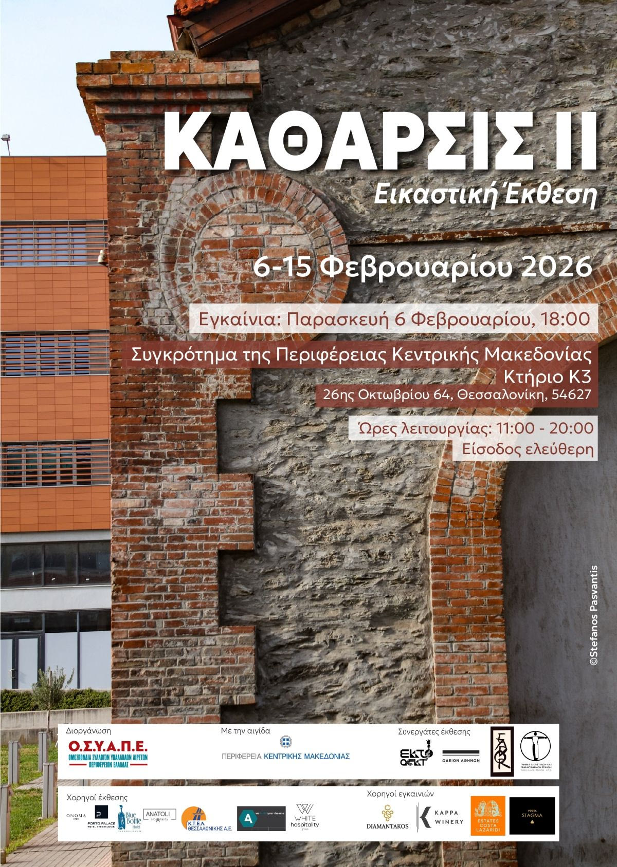 Η Ομοσπονδία Συλλόγων Υπαλλήλων Αιρετών Περιφερειών Ελλάδας (ΟΣΥΑΠΕ), με την αιγίδα της Περιφέρειας Κεντρικής Μακεδονίας παρουσιάζει την εικαστική έκθεση «Κάθαρσις ΙΙ» στο Κτίριο Κ3 της Περιφέρειας Κεντρικής Μακεδονίας (26ης Οκτωβρίου 64).