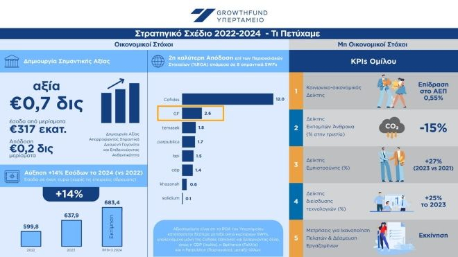 Δημιουργία σημαντικής οργανικής αξίας για την ελληνική οικονομία ύψους €700 εκατ. πέτυχε το Υπερταμείο/Growthfund κατά το διάστημα 2022-2024, με αύξηση των εσόδων κατά 14%, ενώ για το ίδιο διάστημα εισέπραξε €317 εκατ. σε μερίσματα και απέδωσε €186 εκατ. ευρώ στο κράτος.
