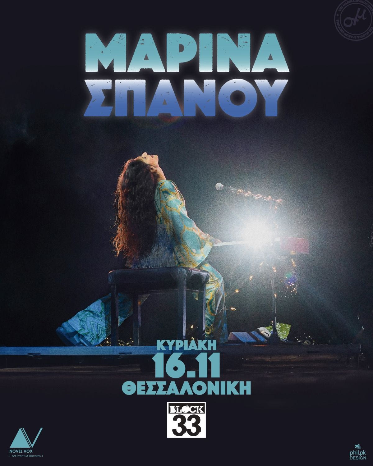 Η Μαρίνα Σπανού, μετά από ένα καλοκαίρι γεμάτο συναυλίες και μία εκρηκτική εμφάνιση στο Λονδίνο για πρώτη φορά, επιστρέφει στην Θεσσαλονίκη. Δίνει ραντεβού μαζί με την μπάντα της, την Κυριακή 16 Νοεμβρίου στο Block33.