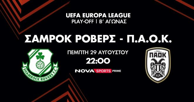 Οι φίλοι του ποδοσφαίρου την Πέμπτη 29 Αυγούστου στις 22:00 θα έχουν την ευκαιρία να δουν ζωντανά στο Novasports Prime τον επαναληπτικό αγώνα του «Δικέφαλου» του Βορρά στο Δουβλίνο κόντρα στην πρωταθλήτρια Ιρλανδίας, Σάμροκ Ρόβερς για τα Play Offs του UEFA Europa League.