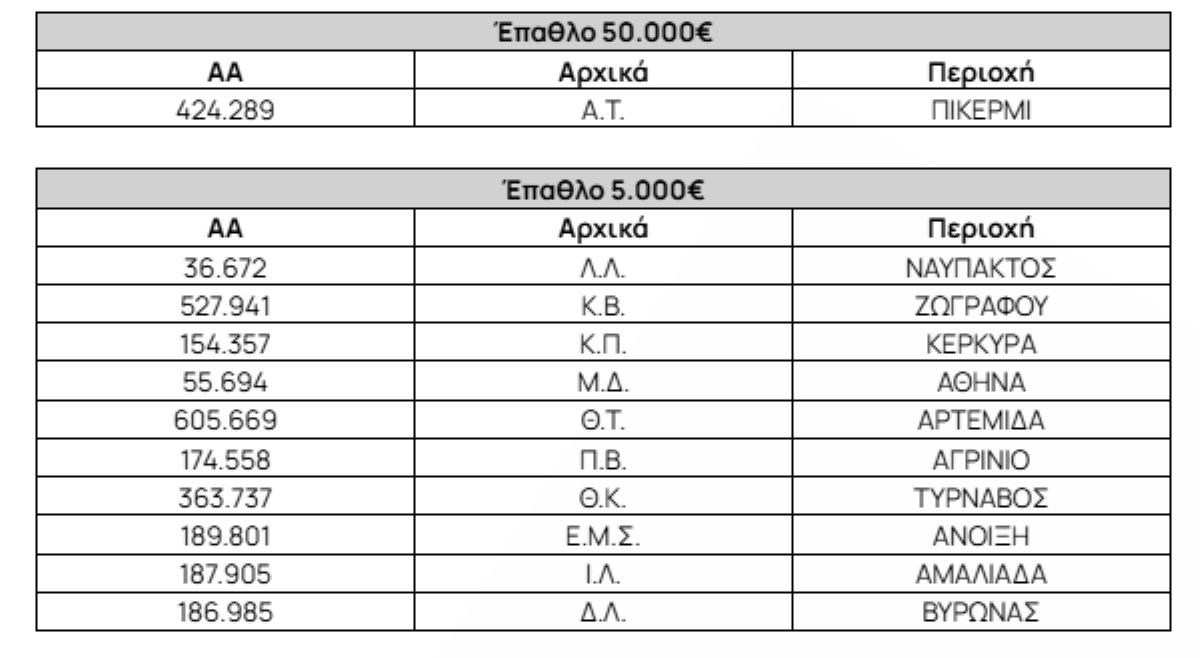 Πιο συγκεκριμένα, στην 9η κλήρωση τα μεγάλα έπαθλα των 50.000€ & 5.000€ να κερδίζουν οι ακόλουθοι: