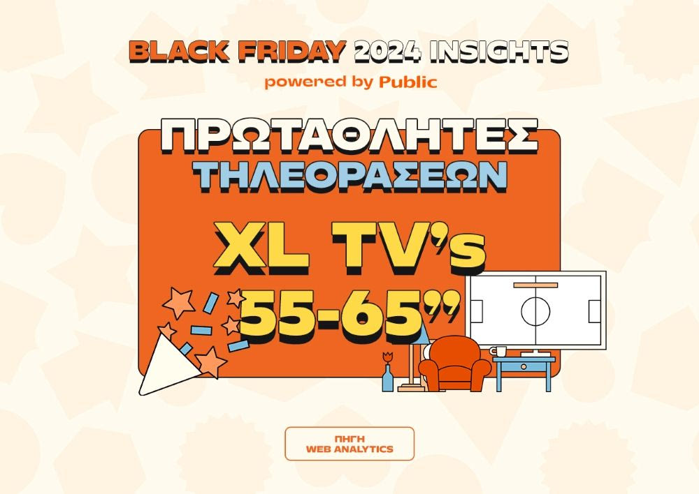 Καθώς πλησιάζουμε στη Black Friday 2025, τα Public παρουσιάζουν τα αποτελέσματα της έρευνας για τη Black Friday 2024, αποκαλύπτοντας τι αγόρασαν οι Έλληνες καταναλωτές και ποιες κατηγορίες προϊόντων και υπηρεσιών ξεχώρισαν, μέσα από εκατοντάδες χιλιάδες συναλλαγές στα καταστήματα Public και στο public.gr