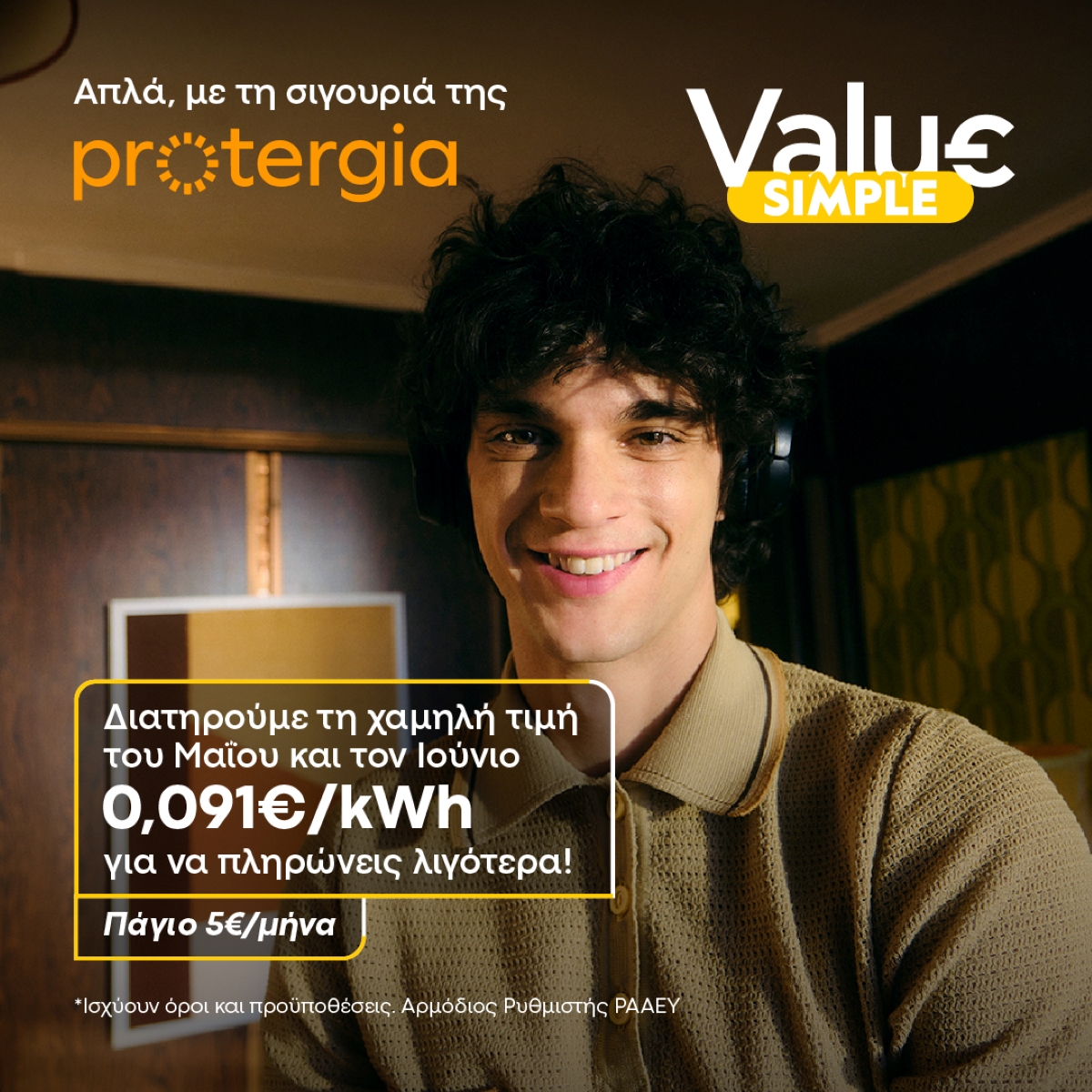 Με το Protergia Value Simple όλοι γνωρίζουν από την 1η κιόλας μέρα του μήνα τι πληρώνουν με απλό και κατανοητό τρόπο, ώστε να μπορούν να κάνουν με ασφάλεια και αξιοπιστία τον μηνιαίο προγραμματισμό τους.