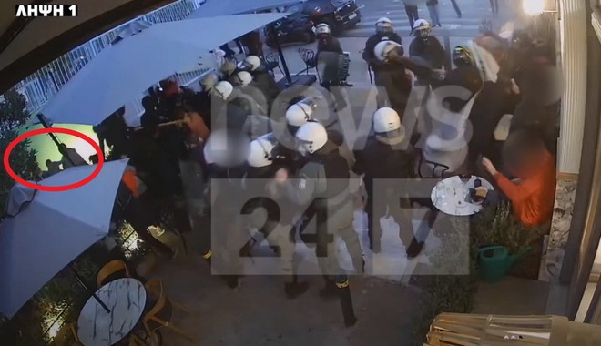 Είναι χαρακτηριστική και ξεκάθαρη η εικόνα στο 0:36 της πρώτης λήψης του βίντεο, όπου ένας άνδρας διακρίνεται να κρατά ένα μωρό στην αγκαλιά του, προσπαθώντας να το απομακρύνει με ασφάλεια από τα τραπεζοκαθίσματα στα οποία, την ίδια ώρα, αστυνομικοί καταφέρνουν αλλεπάλληλα χτυπήματα με γκλοπ και ψεκάζουν με δακρυγόνο αέριο (φυσούνα) διαδηλωτές, ενώ πελάτες του καταστήματος φεύγουν εσπευσμένα από το σημείο.