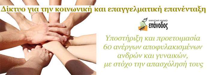 “Η “ΕΠΑΝΟΔΟΣ” ήταν ο συντονιστής φορέας ενός προγράμματος που “έτρεξε” το 2012, ώστε οι άνεργοι αποφυλακισμένοι/αποφυλακισμένες να προετοιμαστούν για την είσοδο τους στην αγορά εργασίας (μετείχαν και οι “Άρσις” και “Δίκτυο Απασχόλησης και Κοινωνικής Μέριμνας”). Το σχέδιο δράσης αφορούσε τη στήριξη 60 αποφυλακισμένων, οι οποίοι είχαν προβλήματα με κοινωνική απομόνωση, οικονομική ανέχεια, προσωπικά αδιέξοδα και τους έδινε κατάρτιση ανάλογα με τον τομέα της επιλογής τους.