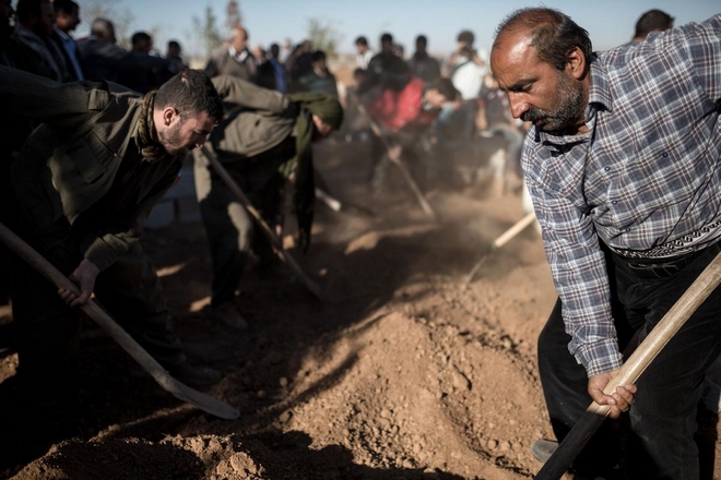 Mourners cover with soil the grave of a Kurdish fighter, killed in the fighting with the militants of the Islamic State group in Kobane, Syria, during a funeral of YPG fighter, at a cemetery in Suruc, on the Turkey-Syria border, November 06, 2014.