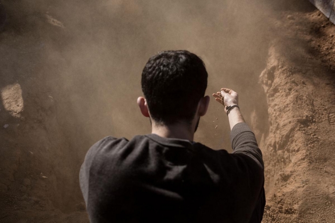 A mourner throws soli as others cover with soil the grave of a Kurdish fighter, killed in the fighting with the militants of the Islamic State group in Kobane, Syria, during a funeral of YPG fighter, at a cemetery in Suruc, on the Turkey-Syria border, November 06, 2014.